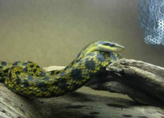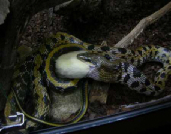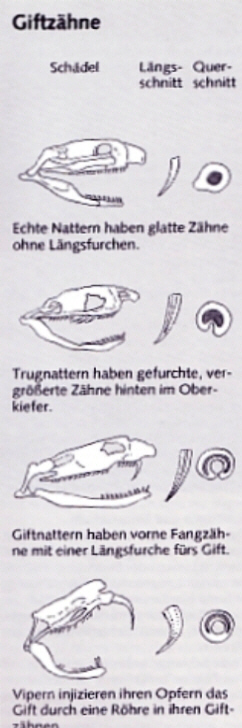 Die Schlange Abstammung der Schlange: Schlangen gibt es schon seit vielen Millionen Jahren. Sie Stammen von den Echsen ab und haben im laufe der Evolution ihre Beine verloren. Reste kann man noch bei den Riesenschlangen erkennen wo noch zwei Aftersporne zu sehen sind. Schlangen sind sehr gute Jäger und können ihre Beute schon von sehr großer Entfernung wahrnehmen. Sie nehmen ihre Beute hauptsächlich mit den Geruch wahr, da sie sehr schlecht sehen und überhaupt kein gehör haben. Die Schönnatter beim durchstreifen des Terrariums ![]() Die Echten Nattern - verfügen über glatte Zähne. Sie haben keine Längsfurchen womit sie ihre Beute mit einem Giftbiss töten könnten. Dadurch werden sie als harmlos eingestuft. Die Trugnattern- haben ganz hinten im Oberkiefer gefurchte und stark vergrößerte Zähne, wo mit Giftdrüsen verbunden sind. Zwar sind Bissunfälle mit Todesfolge sehr selten, aber trotzdem besteht die Gefahr durch einer Vergiftung zu sterben. Dazu gehört beispielsweise: Mangroven Nachtbaumnatter. Die Giftnattern- verfügen über ein paar feststehende Fangzähne vorne im Oberkiefer. Diese Zähne sind mit einer fast vollständigen Längsfurche versehen, durch die das Gift injiziert wird. Dazu gehören beispielsweise: Kobras, Mambas. Die Vipern und Grubenottern- haben vorne im Oberkiefer zwei Fangzähne, die beim Beißen rechtwinklig aufgestellt werden. Die Zähne sind als eine Röhre ausgebildet wie eine Injektionsnadel. Dazu gehören beispielsweise: Kreuzotter, Gabunviper Entnommen aus dem Buch von Klaus Griehl Schlangen ernähren sich von vielen verschiedenen Säugetieren z.B.: Ratten, Mäuse, Fledermäuse, Vögel, Fische, Schlangen, Echsen. Die Schlange schnappt sich ihre Beute und erdrosselt sie, oder tötet sie durch den Giftbiss. Dann wird die Beute mit dem Kopf vor raus am Stück verschlungen, wo sie auch je nach Größe der Beute ihren Kiefer aushängt. Aber manche Schlangen fressen auch Eier die sie durch einen Zahn im hinteren Rachenraum aufschlitzen und dann die Schale wieder auswürgen. Der Verdauungsvorgang kann bis zu 14 Tagen dauern. Es gibt sie überall auf der Welt wo sie sich perfekt an ihre Umgebung angepasst haben z.B: auf Bäumen, in Wälder, im Wasser, in der Wüste und in den Bergen. ![]() Die Schlange häutet sich regelmäßig weil ihre Haut nicht mit wächst. Deshalb wird die alte Haut (Das Natternhemd) in einem Stück abgestreift. In welchen abständen sich die Schlange häutet, hängt von dem Futterangebot und der Temperatur im Terrarium ab. Zwischen der Alten und Neuen Hautschicht bildet sich eine Flüssigkeit, die die Haut und die Augen trüb aussehen lässt. Sobald die Augen wieder klar werden, dauert es noch einige Tage bis sich dann letztendlich die Schlange häutet. In dieser Zeit frisst die Schlange nicht, und ist auch nicht aktiv. Das Natternhemd